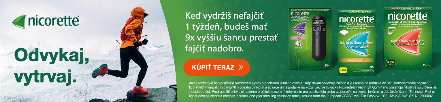Zvažujete, že prestanete fajčiť? Neváhajte a poďte do toho hneď. Vieme, že vydržať nefajčiť stojí veľa síl a pevnú vôľu. Preto stojí Nicorette® stále pri vás. Vedeli ste, že ak vydržíte nefajčiť prvý týždeň, bude vaša šanca prestať navždy až 9x vyššia?