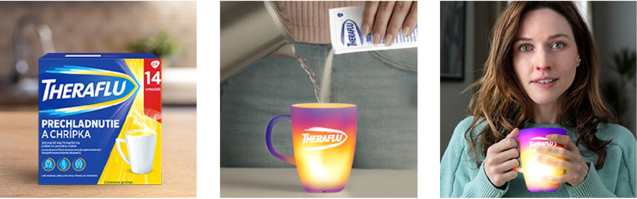 Theraflu horúci nápoj zabezpečuje komfort pri užívaní lieku. Je navrhnutý pre tých, ktorý majú problém s prehĺtaním tabliet alebo kapsúl. Navyše vás zahreje a pomáha udržiavať príjem tekutín.2
