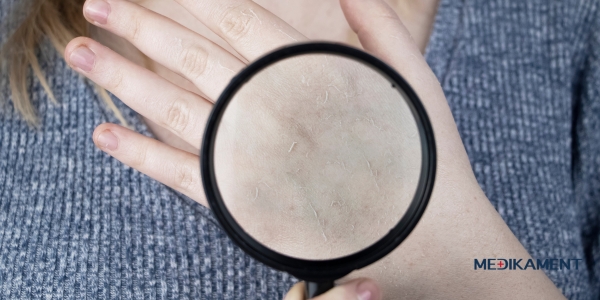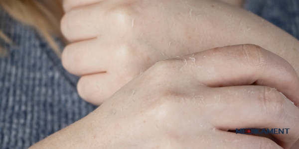Šupinatá pokožka: Postihnutá oblasť môže byť suchá, šupinatá alebo s odlupujúcou sa kožou.