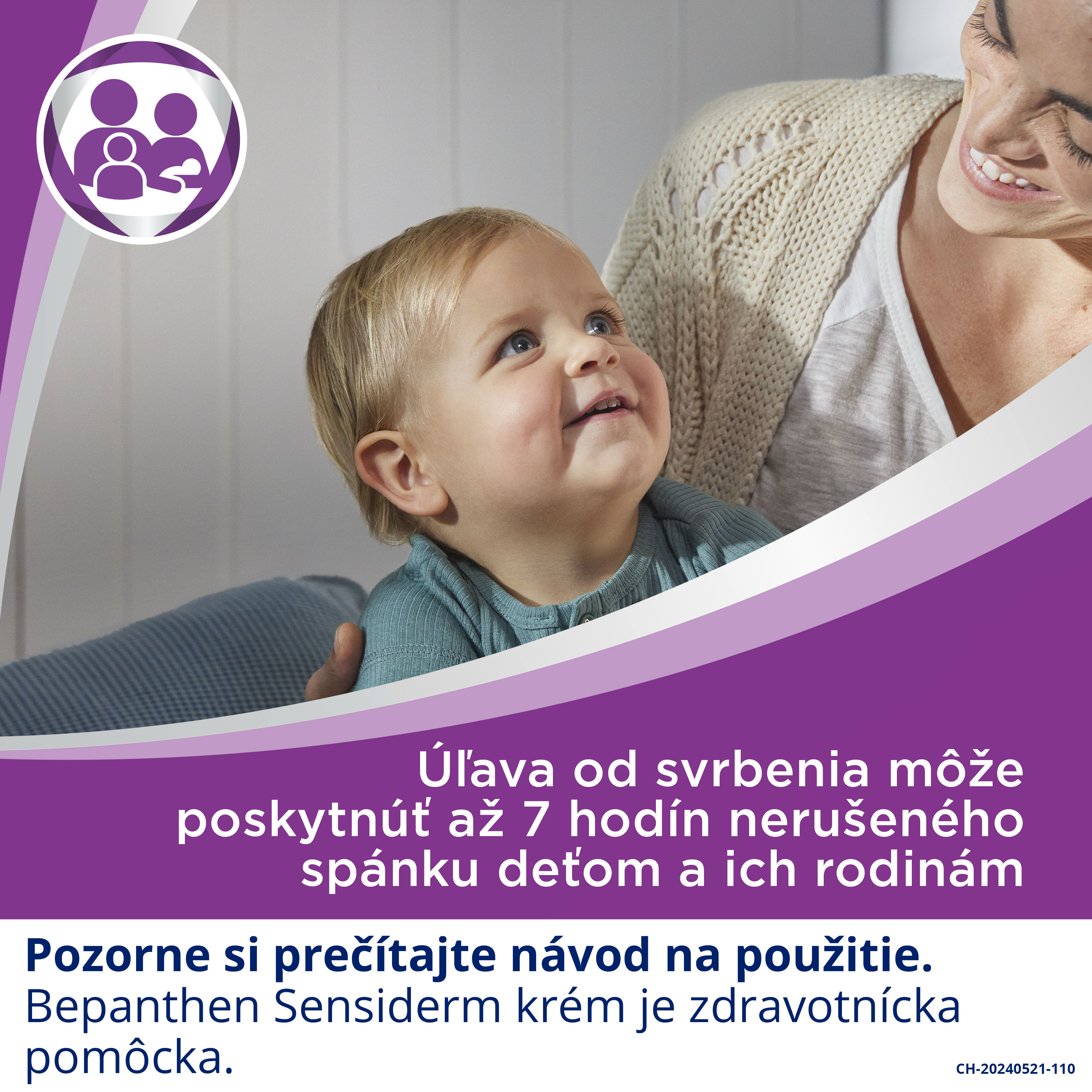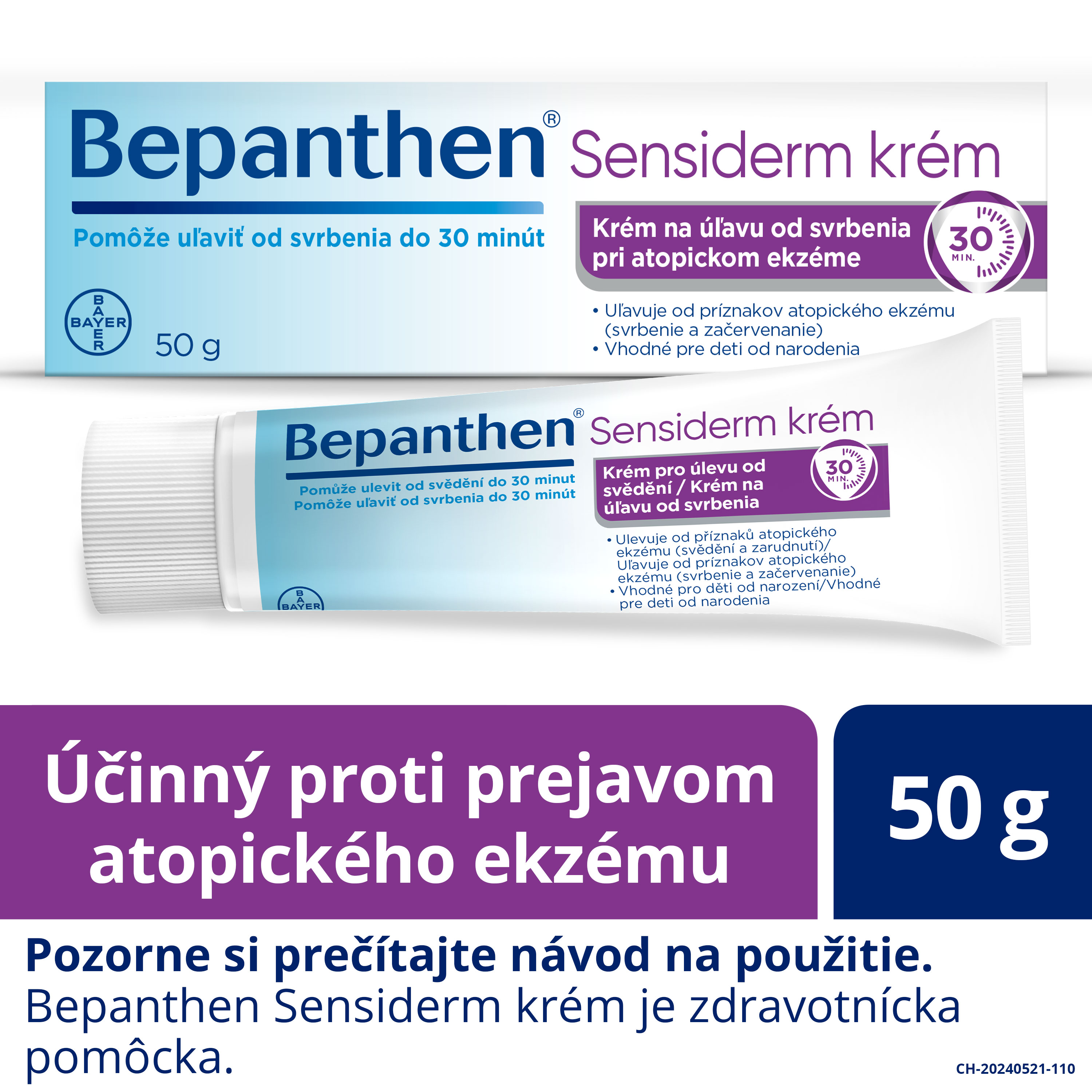 Bepanthen Sensiderm krém je zdravotnícka pomôcka, ktorá prináša rýchlu úľavu od svrbenia a zároveň regeneruje kožnú bariéru. Pokožke tak pomáha k uzdraveniu a znižuje potrebu škriabať sa. Okrem 3,5 % pantenolu, ktorý prirodzene regeneruje a hydratuje, obsahuje lipidy s lamelárnou štruktúrou (technológia LLT) podobnou štruktúre pokožke vlastných ceramidov. Vďaka tejto lamelárnej štruktúre sa lipidy môžu navzájom spájať a viazať na poškodenú lipidovú bariéru a túto „ochrannú stenu“ opäť obnovia, čo vedie k úľave od svrbenia a začervenania. Buďte pri boji s ekzémom vždy o krok vpred!
