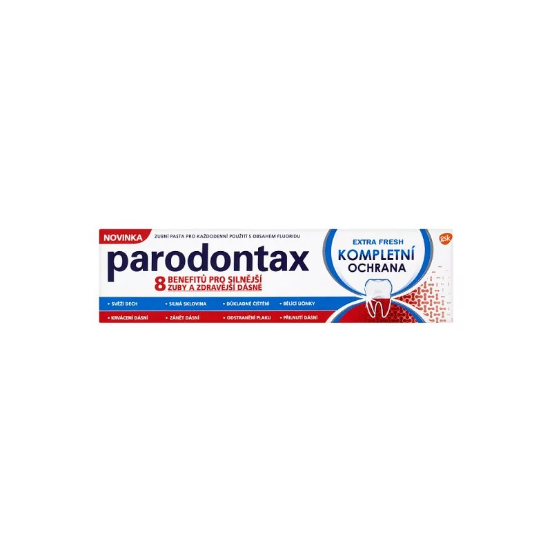 Zubná pasta pre každodenné použitie s obsahom fluoridu. Kompletná ochrana prináša 8 benefitov pri dôkladnom čistení zubov, pre svieži dych a podporu predchádzania problémov s ďasnami.