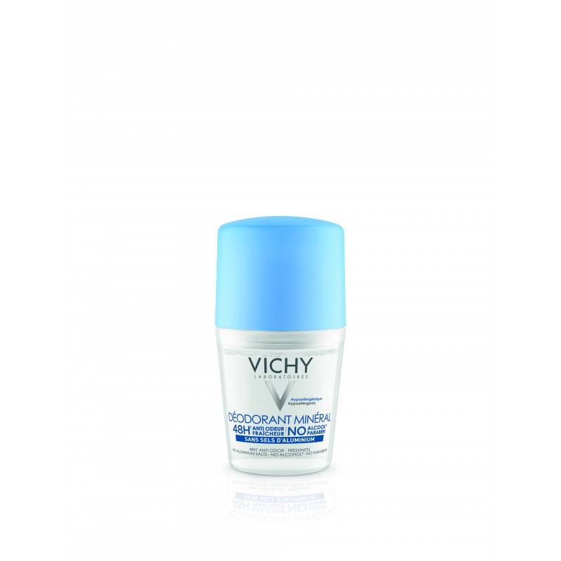 Deo roll-on pre citlivú pleť poskytuje 48h komfort a elimináciu zápachu a sviežosť so silou Termálnej vody Vichy bohatej na minerály.
