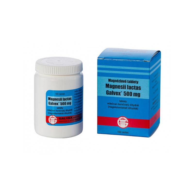 Magnesii lactas Galvex 500 mg sú tablety s obsahom horčíka. Horčík (magnézium) je nevyhnutný pre fungovanie viac ako 300 metabolických procesov v ľudskom organizme. Je dôležitý pre udržanie správnej funkcie nervového systému, pre stavbu kostí, zubov a chrupaviek. Pri jeho nedostatku sa môže objaviť tras, svalová slabosť, svalové kŕče v tvári, na rukách a nohách, porucha hybnosti, psychické poruchy (zvýšená podráždenosť alebo nespavosť), nepravidelnosť srdcového rytmu, tráviace ťažkosti s hnačkou.