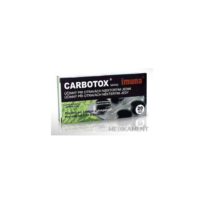 CARBOTOX je liek obsahujúci aktívne uhlie a tiosíran sodný. Aktívne uhlie je črevné adsorbens, čo je látka s veľkým aktívnym povrchom a ochrannými vlastnosťami. V tráviacom trakte sa nevstrebáva a viaže na svoj povrch škodlivé látky, plyny, hnilobné produkty, toxíny, produkty látkovej premeny a rôzne chemické zlúčeniny, ktoré sa týmto stávajú neaktívne. Prítomný tiosíran sodný je laxatívum, t.j. má mierne preháňací účinok.