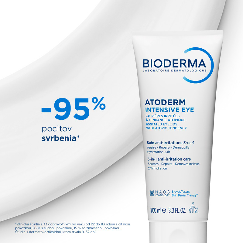 Atoderm Intensive eye, prvá starostlivosť 3v1 o suché a podráždené očné viečka ošetruje najjemnejšiu časť tváre a stáva sa prirodzenou súčasťou každodennej rutiny pacientov, ktorí majú ekzémové zápaly očných viečok, tak isto ako pacientov so suchými alebo zdravými očnými viečkami.