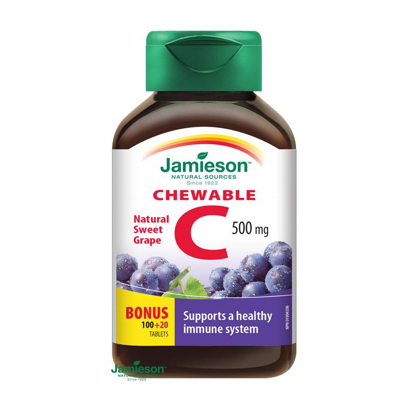 Výživový doplnok s náhradným sladidlom s obsahom vitamínu C vo forme tabliet na cmúľanie s prírodnou príchuťou hrozna s obsahom podpornej zmesi z prírodných zdrojov z rutínu, hesperidínu, bioflavonoidov, malpígie a šípok.