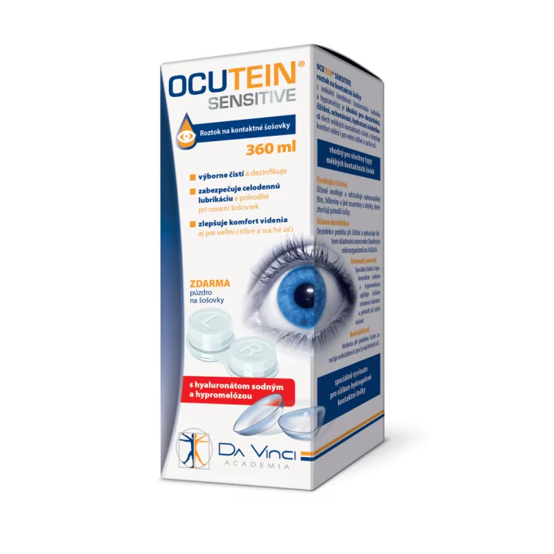 OCUTEIN SENSITIVE roztok na kontaktné šošovky 360 ml je zdravotnícka pomôcka s kombináciou hyaluronátu sodného a hypromelózy, ideálna pre dezinfekciu, čistenie, uchovávanie, hydratáciu a lubrikáciu všetkých mäkkých kontaktných šošoviek.