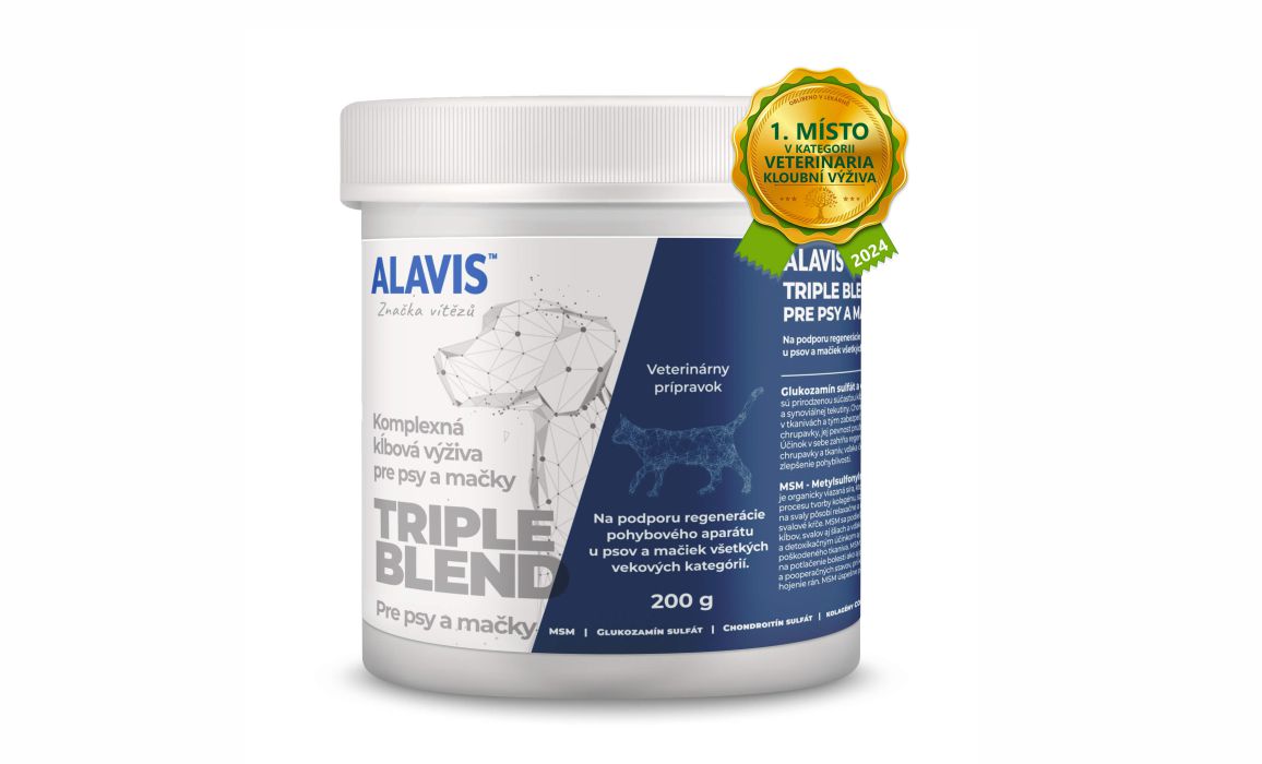 ALAVIS™ TRIPLE blend pre psy a mačky je „špeciálny kokteil“ až šiestich účinných komponentov. Unikátna kombinácia chondroprotektívnych látok (SYSADOA): glukozamín a chondroitín sulfátu, podporená o MSM (organickú síru), doplnená o dva patentované morské kolagény najvyššej kvalite francúzskych značiek COLLYSS™ (kolagén typ I) a CARTIDYSS™ (kolagén typ II) a navyše posilnená o vitamín C. Každá z týchto zložiek hrá dôležitú rolu v starostlivosti o pohybový systém. Sú perfektne vyvážené, aby sa navzájom dopĺňali a podporovali, pričom každá zapadá na svoje miesto ako precízne poskladané puzzle s maximálnou efektivitou, aby spolu vytvorili pevný celok, ktorý poskytuje komplexnú starostlivosť o pohybový aparát.