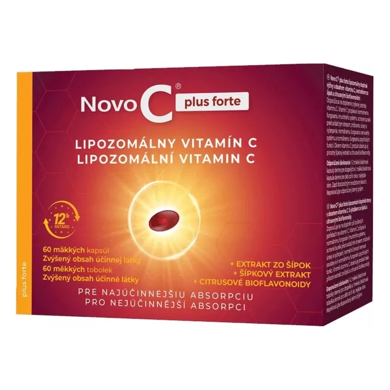 Novo C® plus forte lipozomálny doplnok výživy s obsahom vitamínu C, s extraktom zo šípok a citrusovými biofl avonoidmi. Odporúča sa na doplnenie zvýšenej potreby vitamínu C. Vitamín C prispieva k normálnemu fungovaniu imunitného systému, ochrane buniek pred oxidačným stresom, znižovaniu únavy a vyčerpania, normálnemu fungovaniu nervového systému a normálnemu fungovaniu psychických funkcií. Okrem vitamínu C produkt obsahuje aj prírodný šípkový extrakt a citrusové biofl avonoidy.