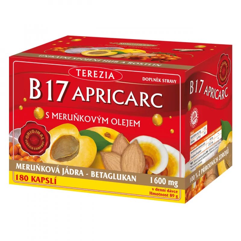 Výživový doplnok vo forme kapsúl. 100 % prírodný prípravok s vitamínom B17 a betaglukánom obsahuje: