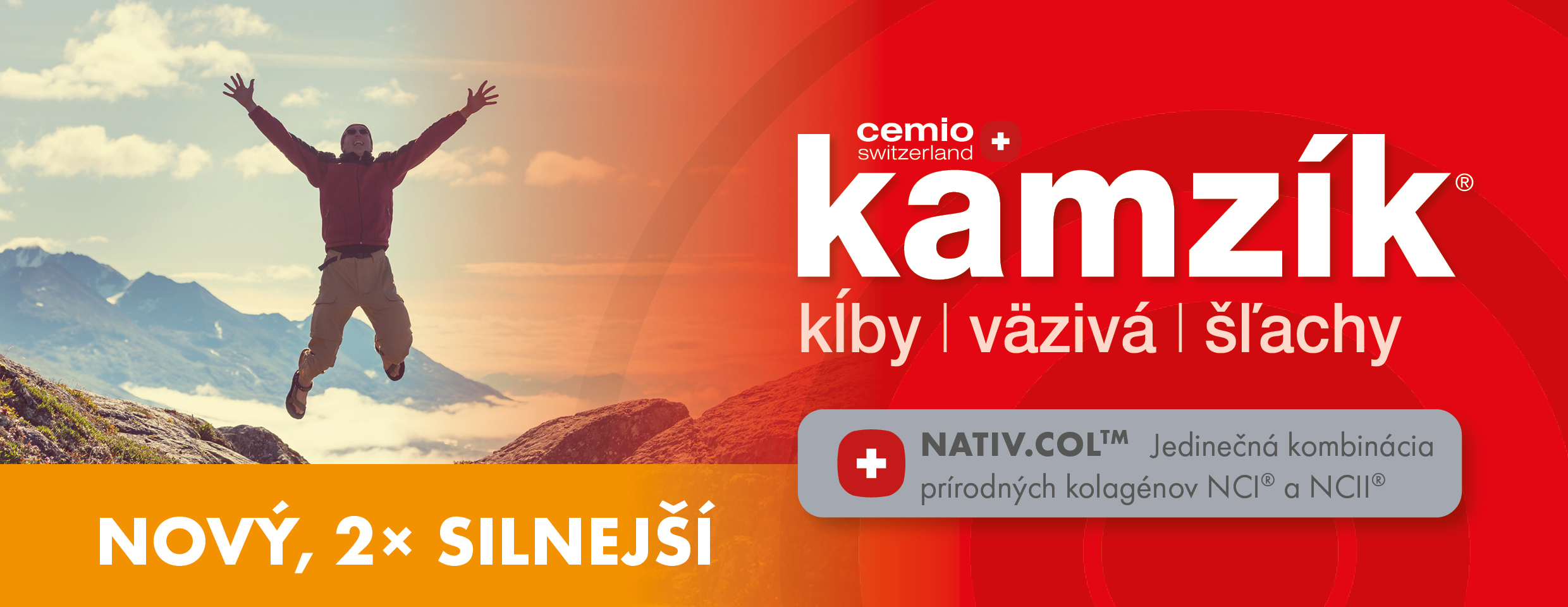 Cemio Kamzík je špičkový kĺbový prípravok, ktorý ako jediný v Slovenskej republike obsahuje kombináciu kolagénu vo forme NCI® (prírodný kolagén NCI a prírodný kolagén NCII) a vitamínu C na kĺby, väzy, šľachy a kĺbové chrupavky.