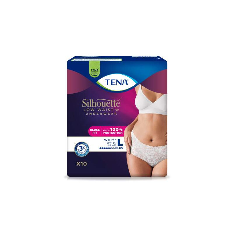 Absorpčné spodné prádlo TENA Silhouette Plus pre ženy so strednou až ťažkou inkontinenciou. Hebké ako bavlna so zníženým krajkovým pásom vyzerajú úplne ako bežná spodná bielizeň.