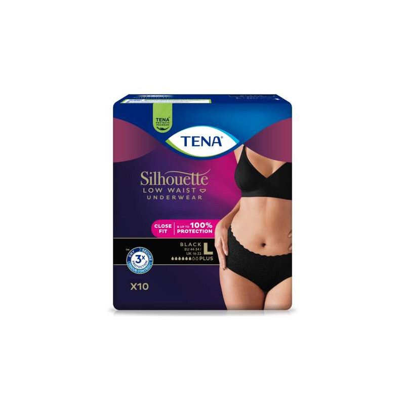 Čierne absorpčné spodné prádlo TENA Silhouette Plus pre ženy so strednou až ťažkou inkontinenciou. Hebké ako bavlna so zníženým krajkovým pásom vyzerajú úplne ako bežná spodná bielizeň.