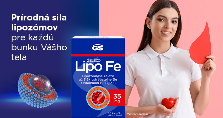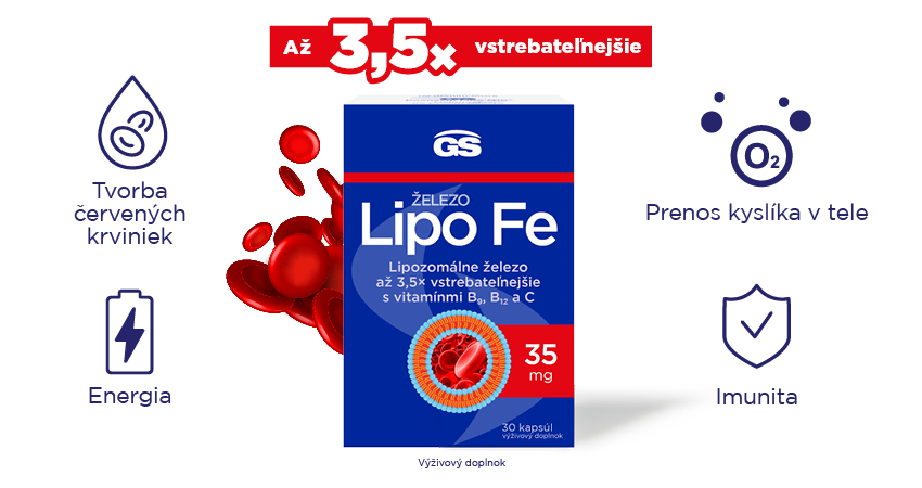 GS Železo Lipo Fe je revolučná forma lipozomálneho železa s až 3,5× vyššou vstrebateľnosťou a maximálnym účinkom. Obohatené o kyselinu listovú, vitamín B12 a C. Vďaka unikátnej lipozomálnej technológii je železo chránené pri prechode tráviacim traktom a dopravené priamo do cieľových tkanív. Navyše lipozómy minimalizujú množstvo nevstrebaného železa, ktoré následne môže spôsobovať značný diskomfort. GS Železo Lipo Fe je tak šetrné pre zažívanie. Vhodné pre vegánov.