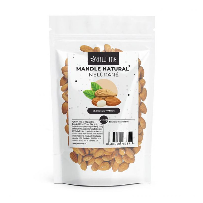 Nelúpané mandle bez konzervantov. Doprajte si čistú chuť prírody s nelúpanými mandľami Raw Me Natural! Tieto vysokokvalitné mandle pochádzajú z ekologicky šetrného poľnohospodárstva a sú 100 % prírodné, bez konzervantov, prísad či umelých dochucovadiel. Nelúpané mandle si zachovávajú vysoký obsah vlákniny, vitamínov a minerálov, ktoré prospievajú zdraviu a celkovej vitalite.