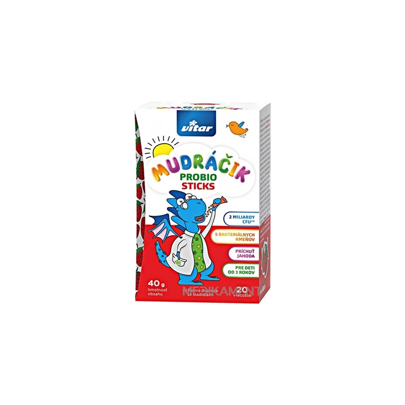 Zloženie: objemové činidlo – maltodextrín, vláknina – GOFOSTM fruktooligosacharidy, kyselina L-askorbová, prírodná aróma, LifeinUTM Bacillus subtillis CNCM I-2745, LactoSpore® Heyndrickxia coagulans MTCC 5856, protihrudkujúce látky – stearan horečnatý, oxid kremičitý, mastenec, kyselina – kyselina citrónová, cholekalciferol, zmes probiotických kmeňov (Lactobacillus acidophilus LMG 8151, Lactobacillus plantarum LMG 26655, Lactobacillus rhamnosus LMG 25626), jahodový prášok 0,1%, sladidlá – sukralóza, citróza (neohesperidín DC).
