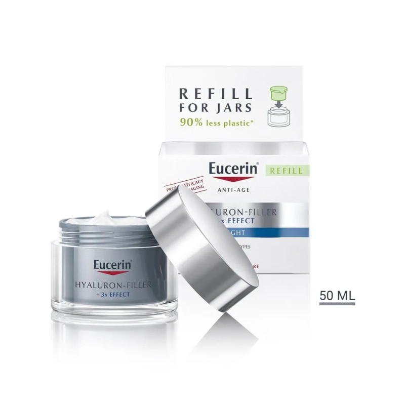 *Obsahuje o 90 % menej plastu ako štandardné balenie Hyaluron-Filler v dóze, 50 ml. Používaním náhradnej náplne pomáhate znižovať plastový odpad a prispievate k udržateľnejšiemu životnému cyklu produktu. Kompatibilná so všetkými Eucerin dózami so starostlivosťou o pleť. Zabráňte kontaktu s očami.