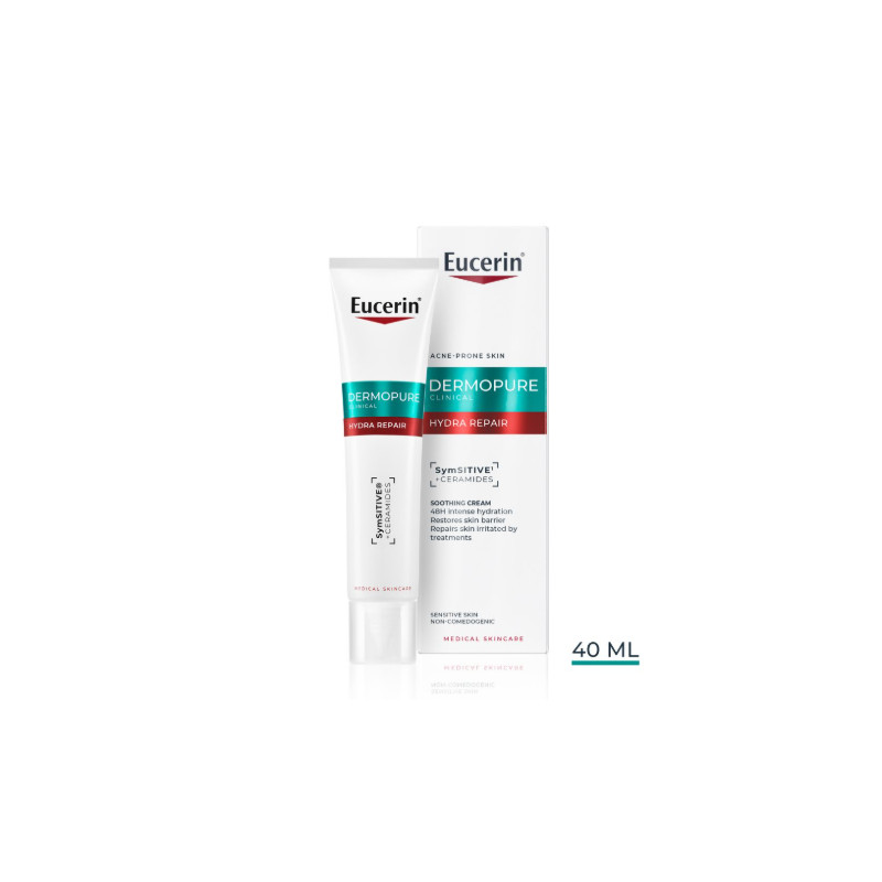 "Eucerin DermoPure CLINICAL Obnovujúci krém je intenzívne hydratačný krém vhodný na upokojenie podráždenej pleti a zmiernenie vedľajších, silne vysušujúcich účinkov liečby akné. Obsahuje unikátnu kombináciu upokojujúceho Symsitive¹ a ceramidov, ktoré podporujú ochrannú bariéru pleti a znižujú stratu hydratácie.