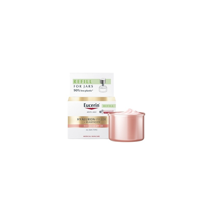 Eucerin HYALURON-FILLER + ELASTICITY Denný krém Rosé SPF 30 s jemne ružovo zafarbenou textúrou vhodný pre pokročilé známky starnutia pleti. Zloženie obsahuje kolagén-elastín komplex, patentovaný thiamidol a kyselinu hyalurónovú. Náhradná náplň obsahuje o 90 % menej plastu*.