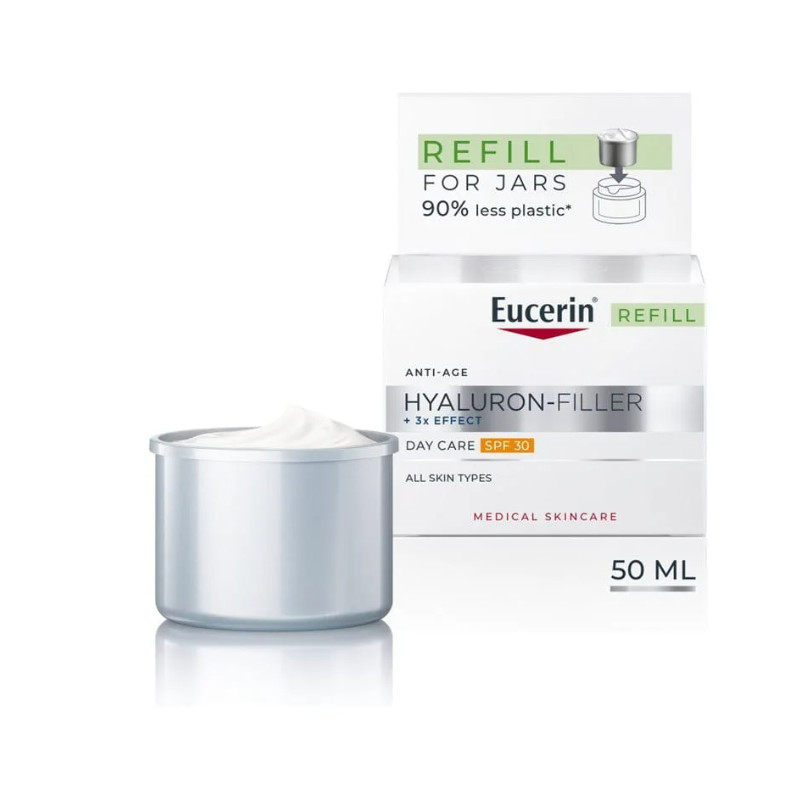 Eucerin HYALURON-FILLER + 3x EFFECT Denný krém SPF 30 poskytuje pevnejšiu pleť, vypĺňa vrásky a hydratuje. Pre viditeľne mladší vzhľad a hladšiu a žiarivejšiu pleť. Náhradná náplň obsahuje o 90 % menej plastu*.