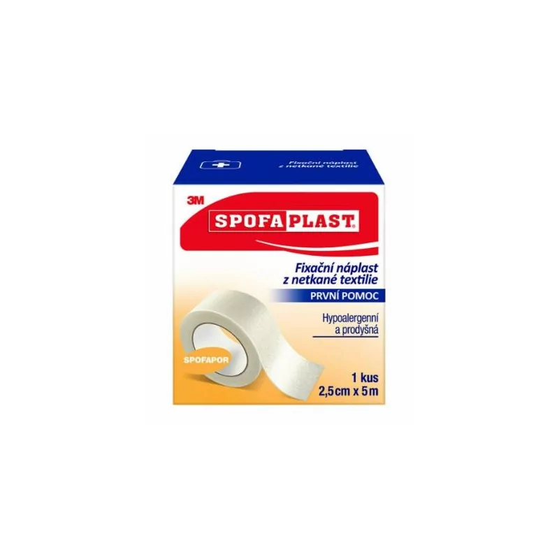 Náplasť na cievke, fixačná náplasť z netkanej textílie bielej farby, so šírkou 2,5 cm.