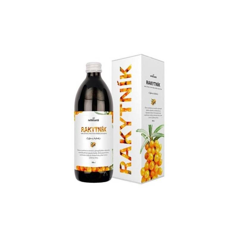 Výživový doplnok. 100 % pasterizovaná šťava vyrobená zo starostlivo vybraných plodov rakytníka rešetliakového (Hippophae Rhamnoides) s prídavkom vitamínu C. 500 ml fľaša zabalené v krabičke.